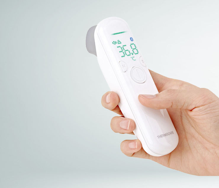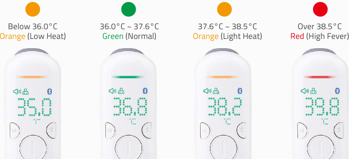 THEMOCARE displays the measured body temperature by number and fever status by color (green for normal, orange for a slight fever, and red for high temperature) on LED display.